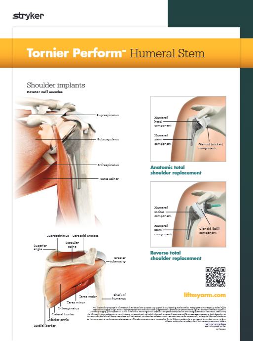 Even with shoulder replacement, you and your doctor have options. Depending on the condition of your shoulder, your doctor may recommend reverse shoulder replacement or total shoulder replacement to relieve your pain and get you moving again. Today, orthopaedic surgeons have access to new tools that assist them in planning for the unique variables of each patient’s shoulder. Advanced technology enables surgeons to match the shoulder replacement solution (surgical approach, implant, and other tools) to a patient’s distinctive anatomy and joint condition. Like any surgery, joint replacement surgery has serious risks. Speak to your doctor to decide if joint replacement is appropriate for you.